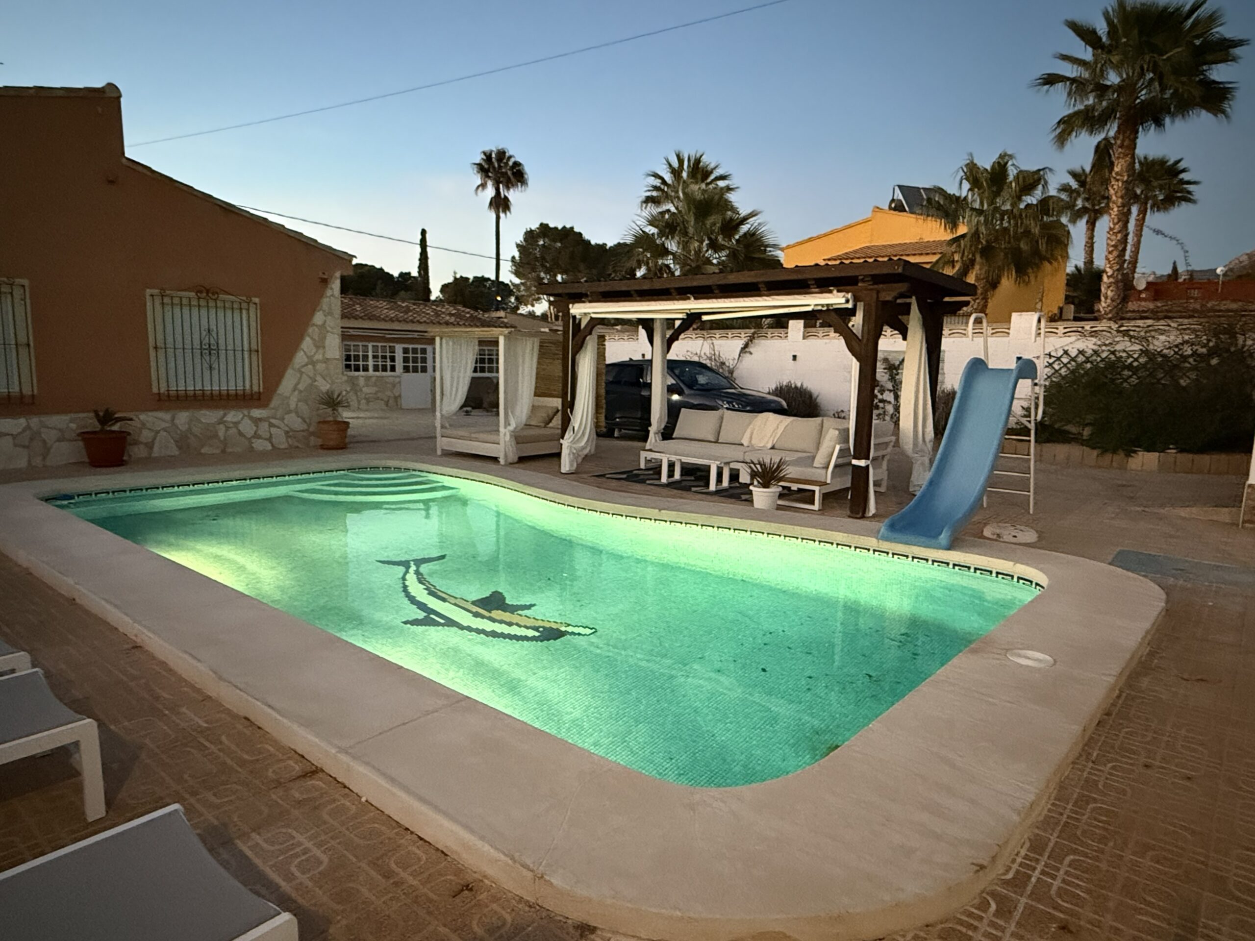 Stap binnen in een exclusieve familievilla in Busot, waar luxe en comfort samenkomen met privacy en ruimte. Het hart van de villa is het royale zoutwaterzwembad van 9 x 4,5 meter met glijbaan — perfect voor urenlang speelplezier voor de kinderen en ontspannen momenten voor volwassenen.