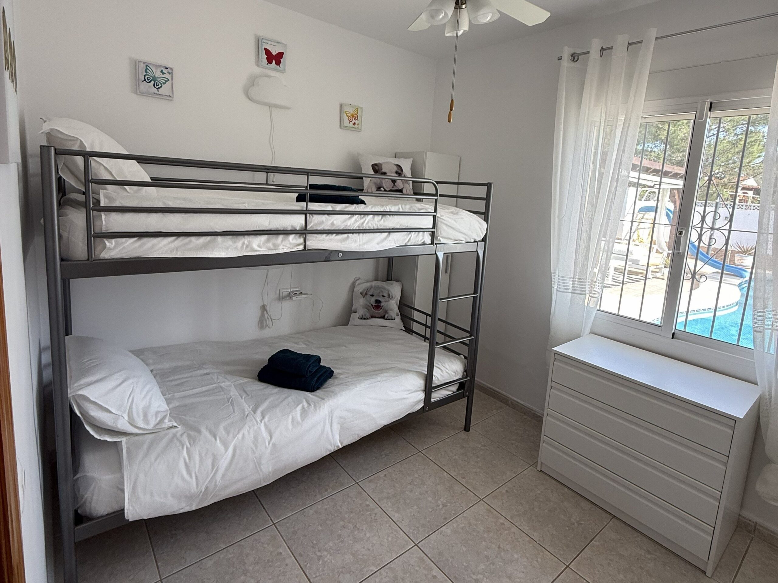 Slaapkamer met een stapelbed van 90 x 200 cm met nachtlampjes. Inbouw kledingkast en airconditioning.